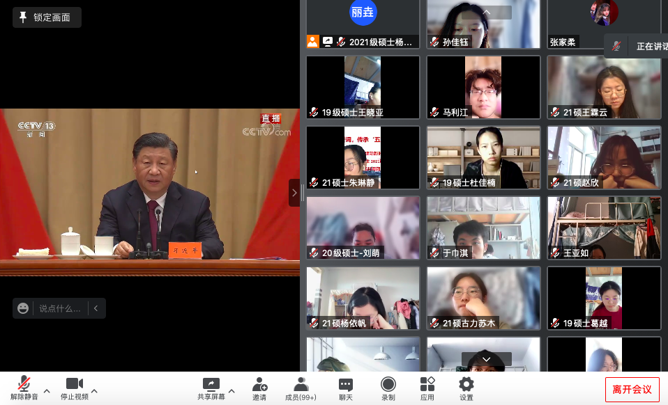组织全体团学组织骨干、党支部和团支部全体同学线上观看庆祝大会,学习领会总书记讲话精神,会后开展学习讨论。