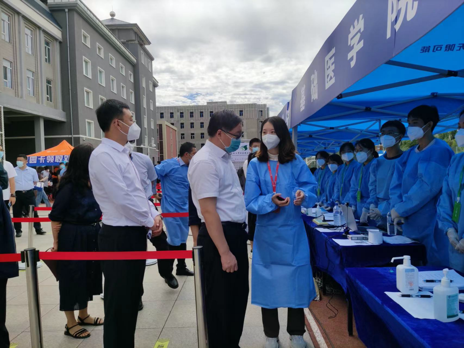 院长王放、党委书记王晓荣、副院长李洪岩、综合办公室主任丁红枫、研究生辅导员孙佳钰在迎新现场热情地新生亲切交流,叮嘱同学们注意做好个人防护,迎接崭新的校园生活。