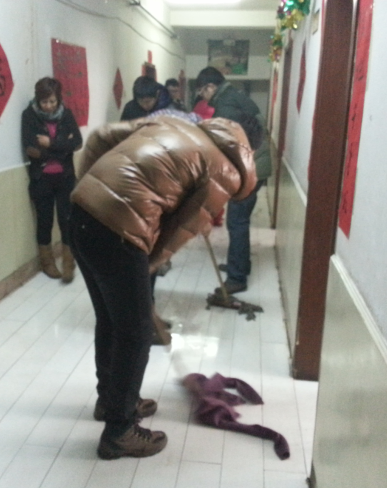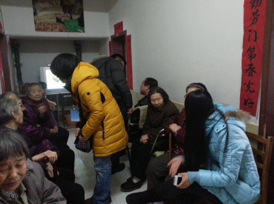早晨,冒着寒风,志愿者们来到集安路养老院,首先12级的志愿者们向老人们和工作人员们介绍了日常保健保养和老年病患者护理的知识。随后,志愿者们便向老人们表演了精心准备的节目,不仅有充满活力的流行歌曲,还有用俄语演唱的经典老歌,很多老人伴着俄语的东方红一起唱起来。与此同时,另一部分志愿者在各个房间忙碌了起来,做起了清扫工作。
