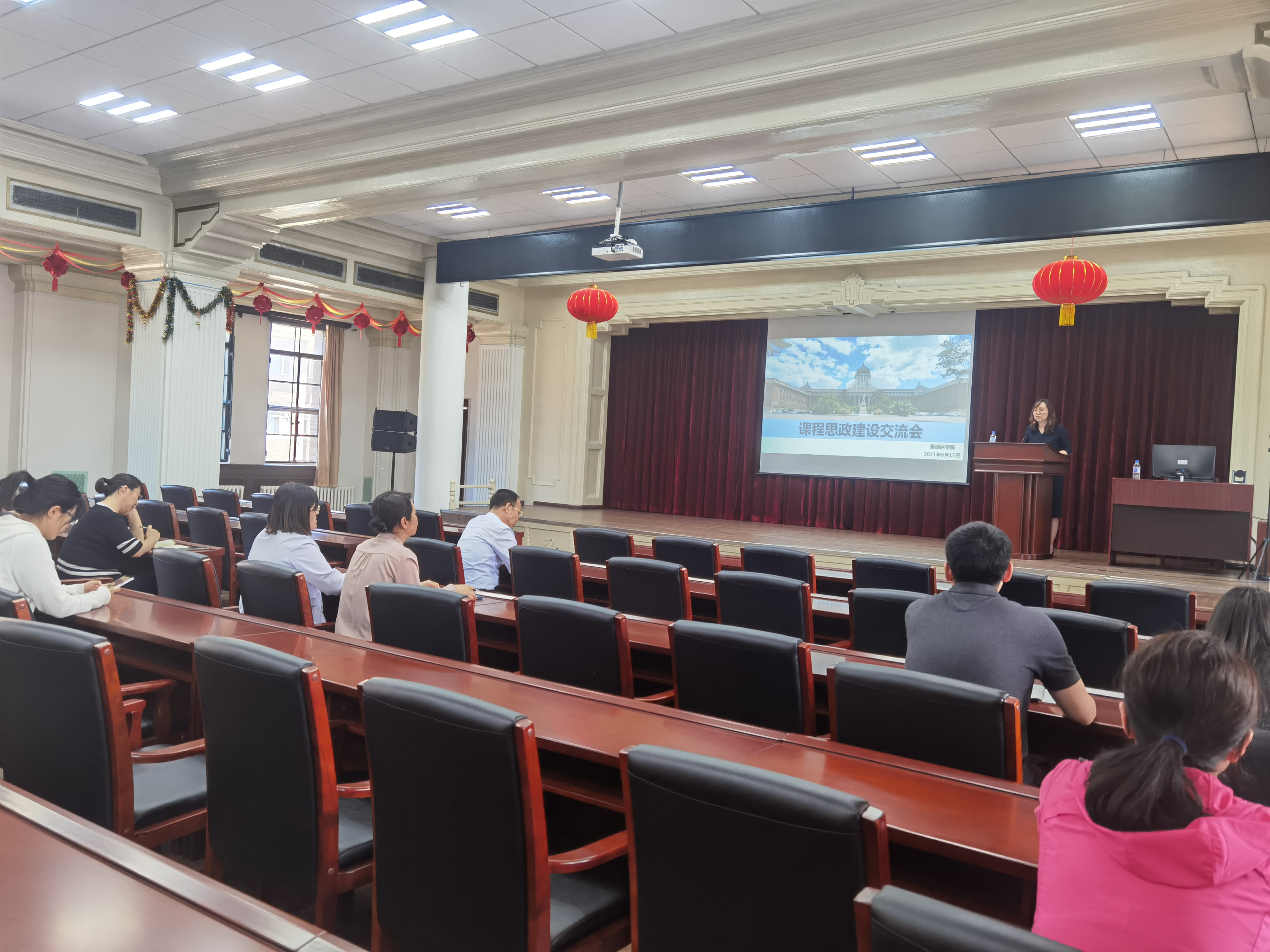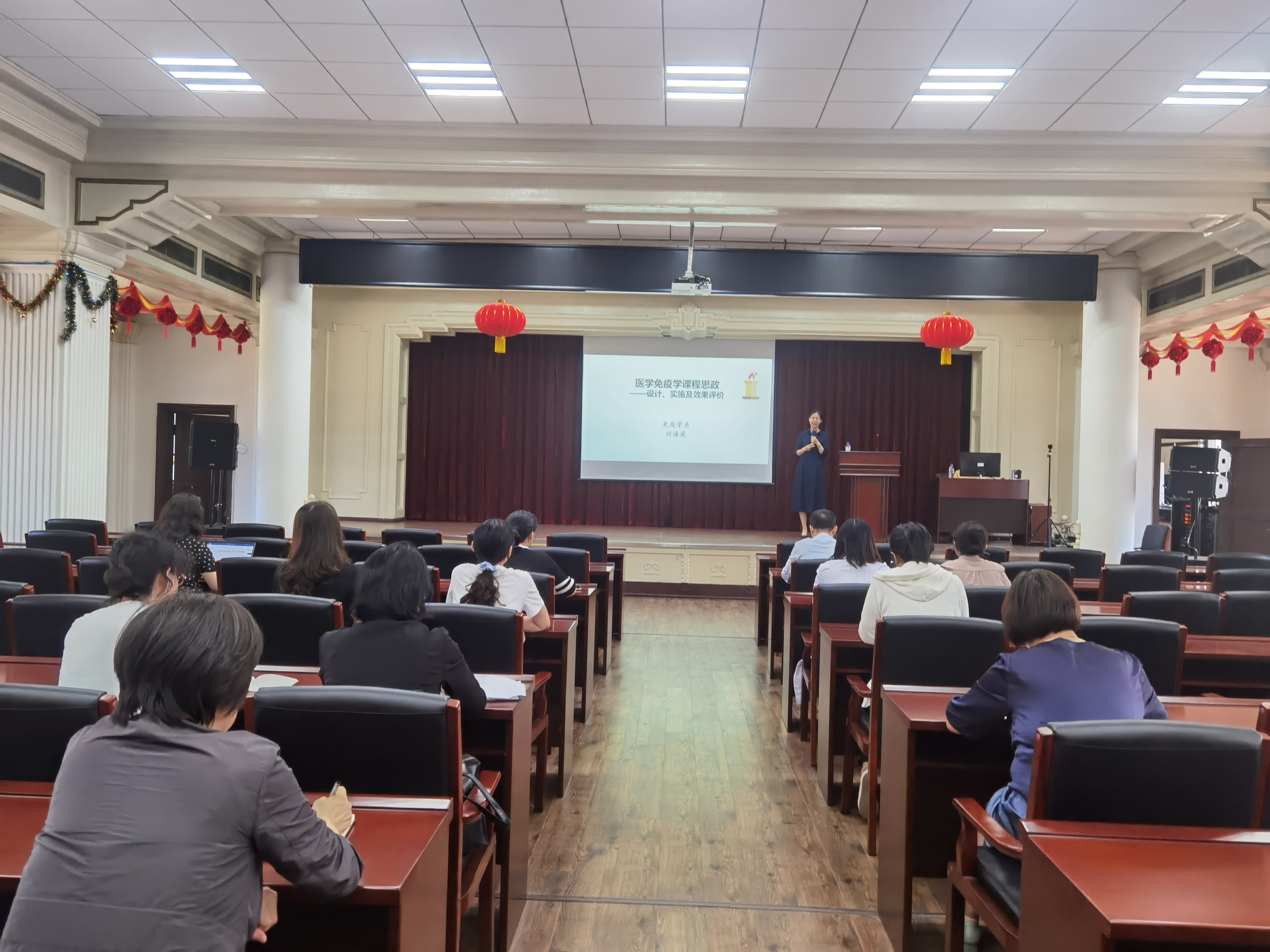 全面推进课程思政建设工作实施方案,号召各学系要将学科特色与医学教育特点相结合,把思想教育工作贯穿到教育教学全过程,要充分发掘基础医学课程蕴含的思政元素。随后,医学免疫学系付海英老师分享了《医学免疫学课程思政的设计、实施及效果评价》,介绍了本学系如何将知识传授与立德树人深度整合、将思政路径与教学方式有机融合。此外,还介绍了学系教学紧密联系“家国情怀与大局观念”,采取了多种思政路径,将价值塑造、知识传授和能力培养三者融为一体,并围绕教师“主力军”、课程建设“主战场”、课程教学“主渠道”,通过教师渗透与输入、学生思考与交流,实现教书育人的目标。
