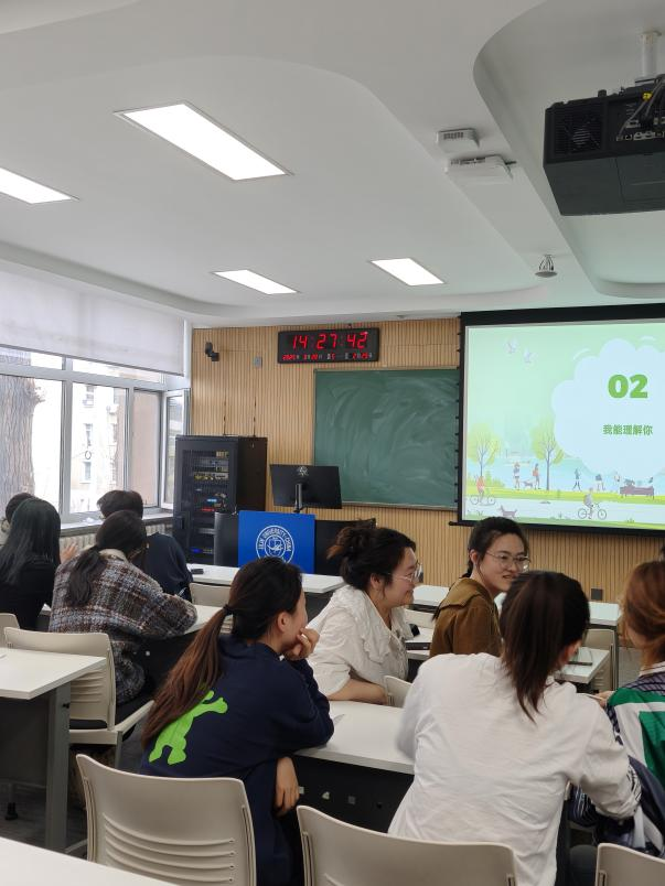 活动以"有缘人报数"拉开序幕。在朋辈心理辅导员的引导下,同学们分为4组,每位同学为自己起一个独特的新昵称,并设计与之对应的代表手势。在轻松愉快的氛围中,大家相互分享新昵称与手势背后的含义,欢声笑语不断,有效缓解了科研带来的压力,让同学们迅速放松下来,为后续的心灵探索之旅奠定了良好的氛围。紧接着,同学们通过“情绪温度计”角色扮演直观地评估自己当下的情绪温度,随后凭借对他人表情、肢体语言的细致观察,推测他人的情绪温度。这一环节极大地提升了同学们的情绪感知和共情能力,让大家深刻体会到每个人的情绪都是独特且值得被理解的。在"我能理解你"情景剧场中,两组同学通过角色互换与"倾听-猜测"练习,引导同学们分享自己的心情并了解和体会沟通的重要性。此外,同学们还踊跃分享了在生活中能够为自己提供支持和帮助的人及事物。无论是家人的暖心陪伴,还是朋友的鼓励安慰,亦或是阅读、运动等兴趣爱好带来的心灵慰藉,这些宝贵的支持资源,让大家在感受到温暖的同时,进一步明确了获取心理支持的途径。