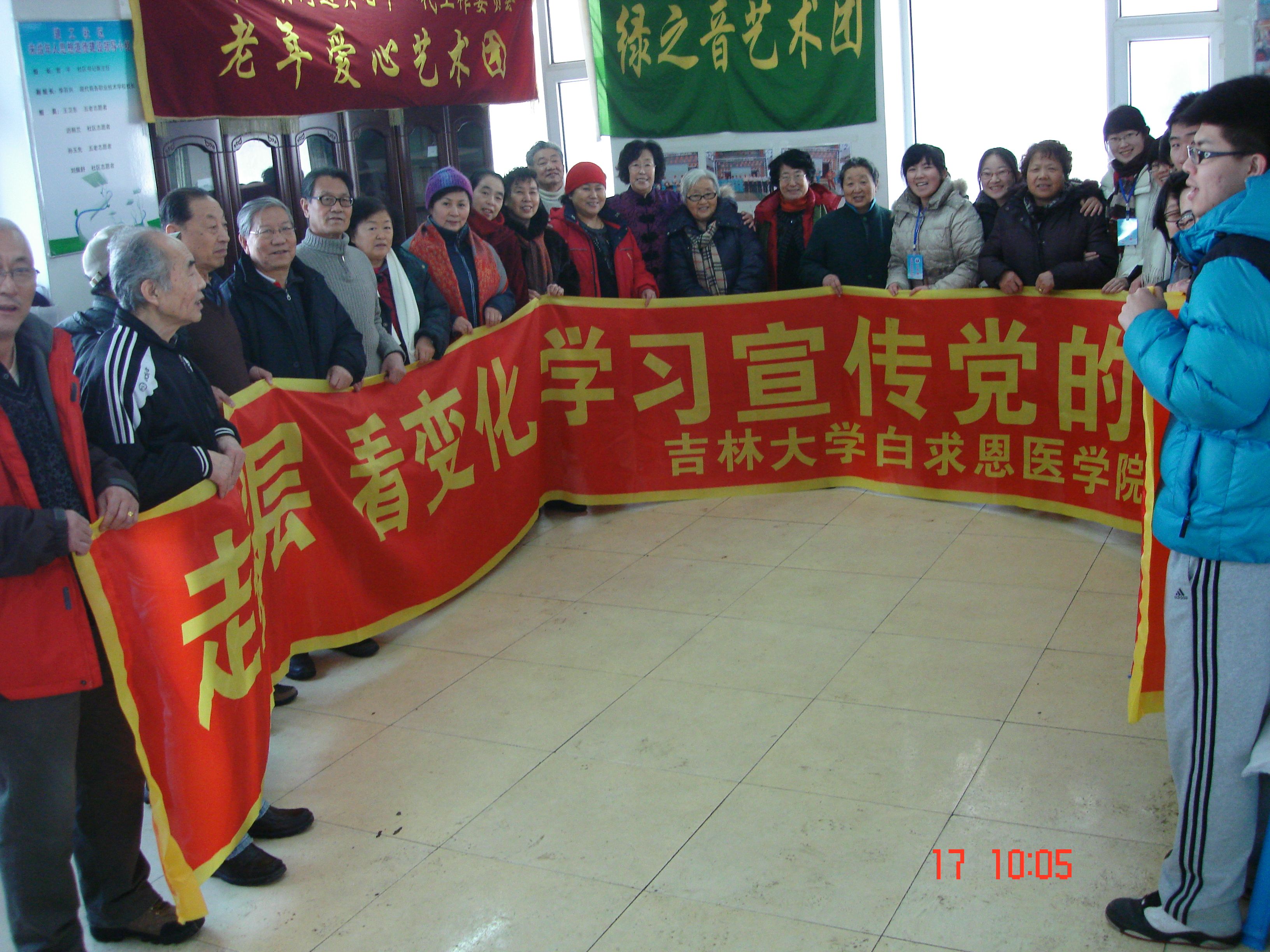 志愿者们来到建工社区,首先向在社区活动室活动的社区居民,介绍了十八大的新精神并和大家一起讨论了社区医疗的变化,紧接着志愿者们发挥自身学科优势,用通俗易懂的语言讲解常见慢性病,老年病的预防。同时,社区的老人们对同学们的到访也表示热烈的欢迎,在社区的老年合唱团的提议下,志愿者队伍与合唱团的老人们进行了“以歌会友”的活动。在社会实践的过程中,温暖欢快的氛围感染着在场的每一个人。