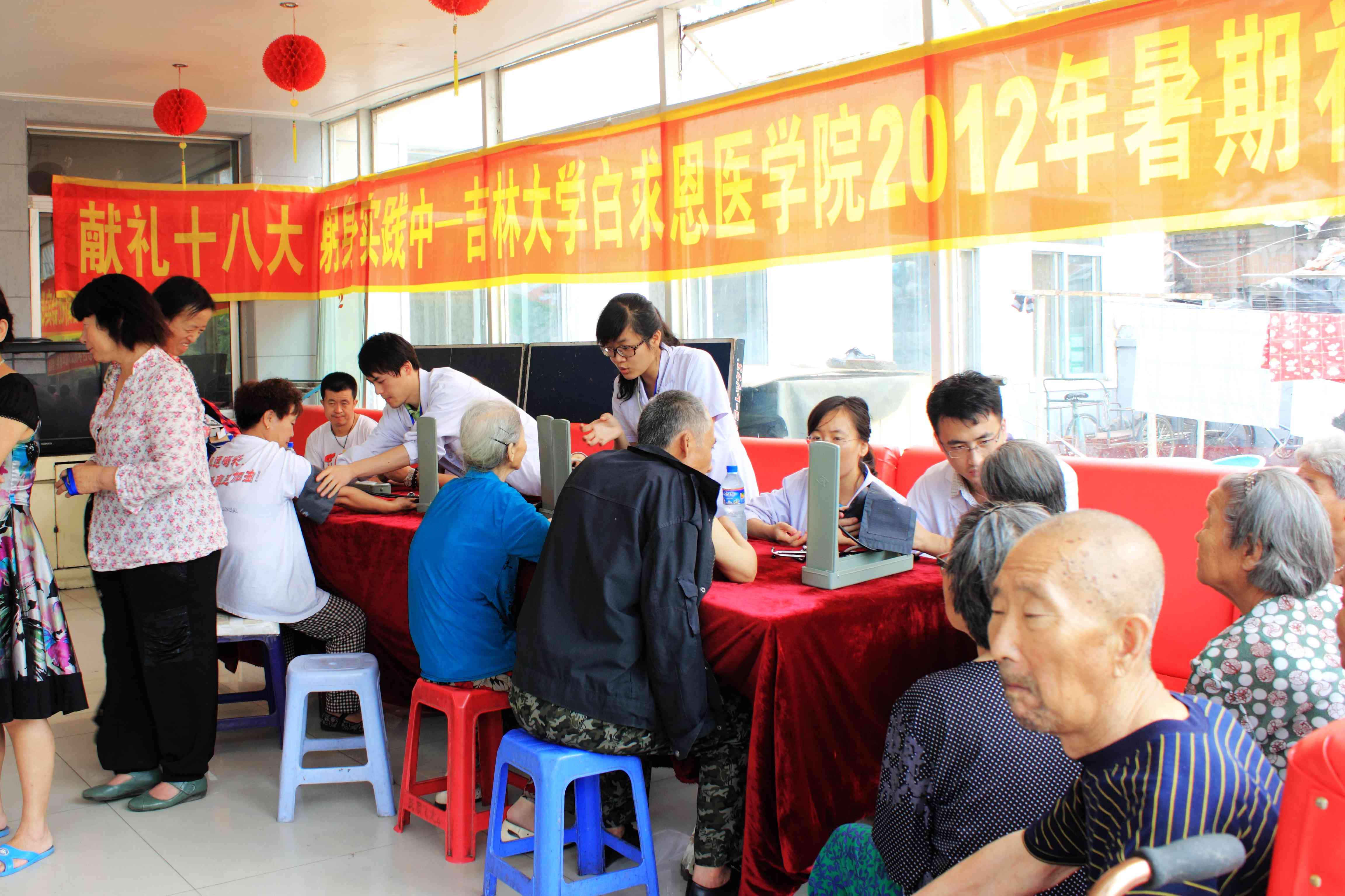 27名志愿者在学生工作办公室主任吴剑锋、辅导员魏宇航的带领下前往长春市东盛街道鑫旺社区同心老人院进行医疗进社区志愿服务活动。