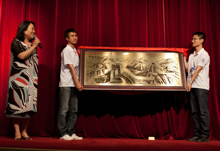 献上纪念匾额——万里长城,并送上“杏林万年红,桃李满天下”的祝福。