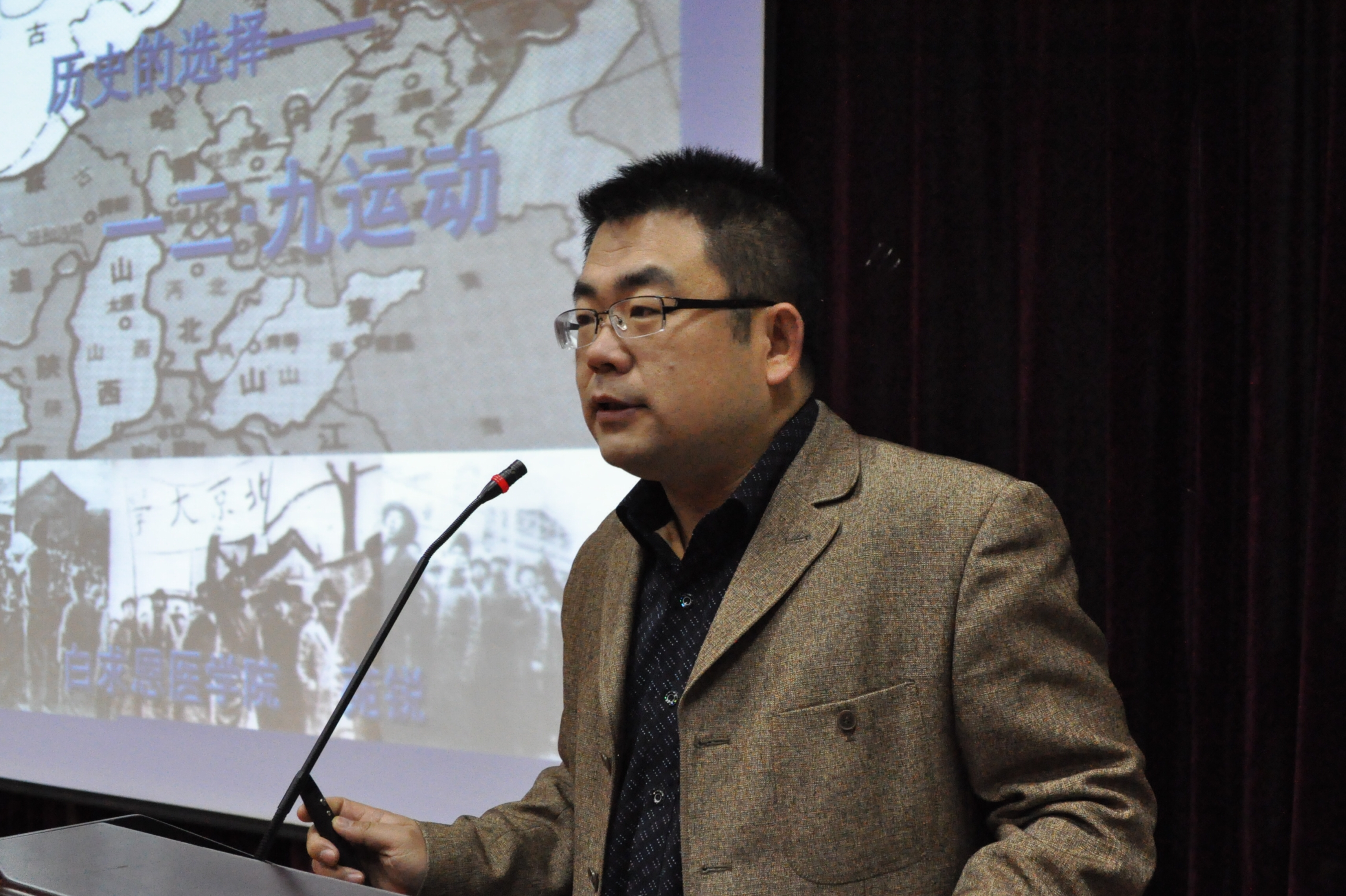 仪式结束后,进行团校的第一次培训。特聘讲师苑锐结合“一二·九”这个特殊的日子,做了《历史的选择—— 一二·九运动》的专题报告。他从“一二·九”运动发生的背景、进程、历史意义等方面进行阐释。同时结合历史大潮中历史人物的思想转变和命运决择,给同学们还原了75年前,在风声鹤唳的华北开展的波澜壮阔的爱国运动。